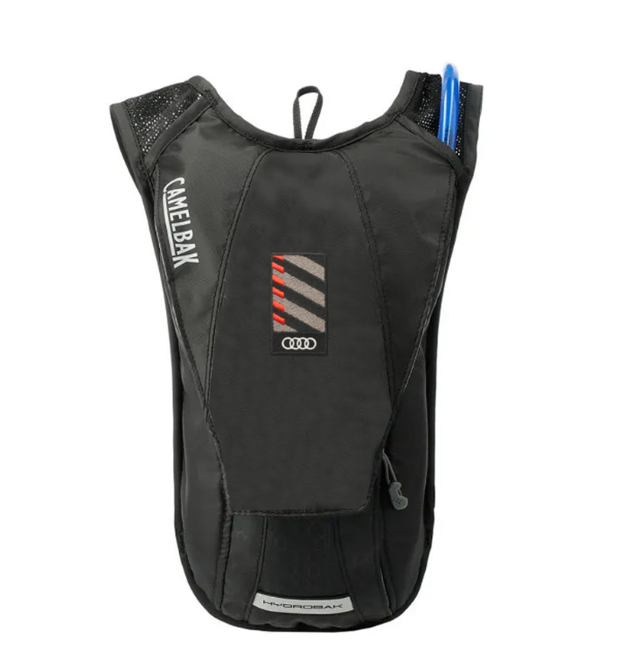 When all you want is water, the CamelBak Eco-Hydrobak minimalist bike pack has you covered. It can carry enough water for a 2-hour ride and also includes a safe zip pocket for keys and essentials that measures 6" by 4". The New Crux reservoir also offers 20% more water per sip for faster hydration in the saddle. This bag is made with waterless dyed lining, recycled poly airmesh back panel. Includes water reservoir with 1.5L capacity. Embroidered patch with AUDI rings logo.